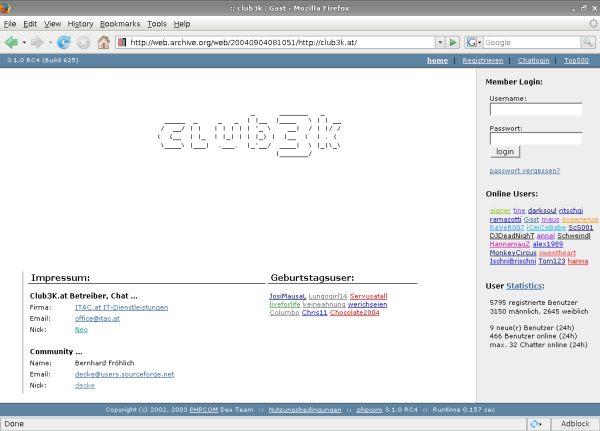 Es sind nur mehr wenige denen der Begriff Netonline oder in der korrekten schreibweise //etonline noch etwas sagt. Die plötzliche Schließung von Netonline im Frühjahr 2003 hat einige hundert vorwiegend Salzburger Stammchatter hinterlassen die sich nicht damit abfinden konnten. Einige davon haben es wohl geschafft in Andi den richtigen Nerv zu treffen und so hat er sich eines Tages bei mir gemeldet und mich gefragt was ich davon halte einen Nachfolger für Netonline aufzubauen. Meine Antwort könnt ihr euch wohl vorstellen und so sind wir dann zusammen mit Martin der sich um die Technik gekümmert hat im September 2003 pünktlich zu Schulbeginn mit Club3k online gegangen.