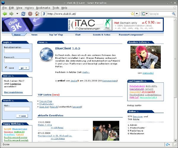 Aus der Not geboren, ohne konkretes Ziel aber mit komplett selbst entwickelter Software. Das sind keine guten Zutaten für eine erfolgreiche Zukunft aber die Community war damals im Vergleich zu anderen durch ihre Galleries und die User etwas besonderes und die Lungauer Chatter haben uns nicht im Stich gelassen. So ist Club3k stetig gewachsen und das teilweise weit schneller als uns lieb war denn angefangen haben wir auf einem alten Athlon 1800+. Der war allerdings nach einem Jahr bereits völlig überlastet und so blieb uns im Frühjahr 2006 nichts anderes übrig als einen Dual Xeon 3Ghz zu kaufen der nach damaligen Schätzungen ziemlich überdimensioniert war. Wir hatten allerdings bereits nach einem halben Jahr fortwährende Stabilitätsprobleme da die Datenbank dermaßen überlastet war, dass wir sogar gezwungen waren mehrere Millionen alter Gästebucheinträge zu löschen um nur irgendwie den Winter zu überstehen. Im Frühling darauf folgte dann ein Core2Duo 2.4Ghz als neuer Datenbankserver der seitdem ununterbrochen läuft und seinen Dienst verrichtet. Damit stand dem weiteren Wachstum nichts mehr im Weg und das kam dann auch denn der Herbst 2007 war eine wirkliche Bewährungsprobe für die gesamte Software und Hardware und auch gleichzeitig der Höhepunkt des Wachstums. So haben wir es innerhalb von etwas mehr als 4 Jahren auf ziemlich genau 68.000 registrierte User und 950.000 Bilder geschafft.