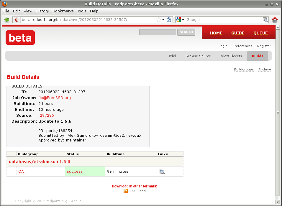We used to have a FreeBSD Ports QAT machine that did automatically build all affected ports after a commit. Well that machine is down since quite some time now because of an hardware defect I think. In my plans for redports I started quite early to think about integrating the QAT service so I talked to itetcu at BSDDay in 2011 about the current implementation of the QAT system. It works by parsing the ports CVS mails to find out which ports are affected by the commit. Then it updates the CVS tree from one of the tier1 CVS mirrors and hopes to have a consistent portstree. After that it schedules new jobs in the Ports Tinderbox and sends out mails to the committer if building failed. That worked fine most of the time but it had quite some weak spots which required to constantly look after the machine to keep it going. The most important thing that I learned from that was that we need to migrate our ports repository from CVS to something that allows a consistent checkout. Now that beat is working on the cvs to svn migration and has a testing repository I used that to implement QAT functionality into the redports infrastructure. Instead of parsing CVS mails I can use svn info to find new commits and consistent repository checkout is also guaranteed by subversion. After all it took me about one working day to fully integrate the QAT functionality and test the new stuff. There are a few benefits for the upcoming QAT system now that it is a part of the regular redports infrastructure: